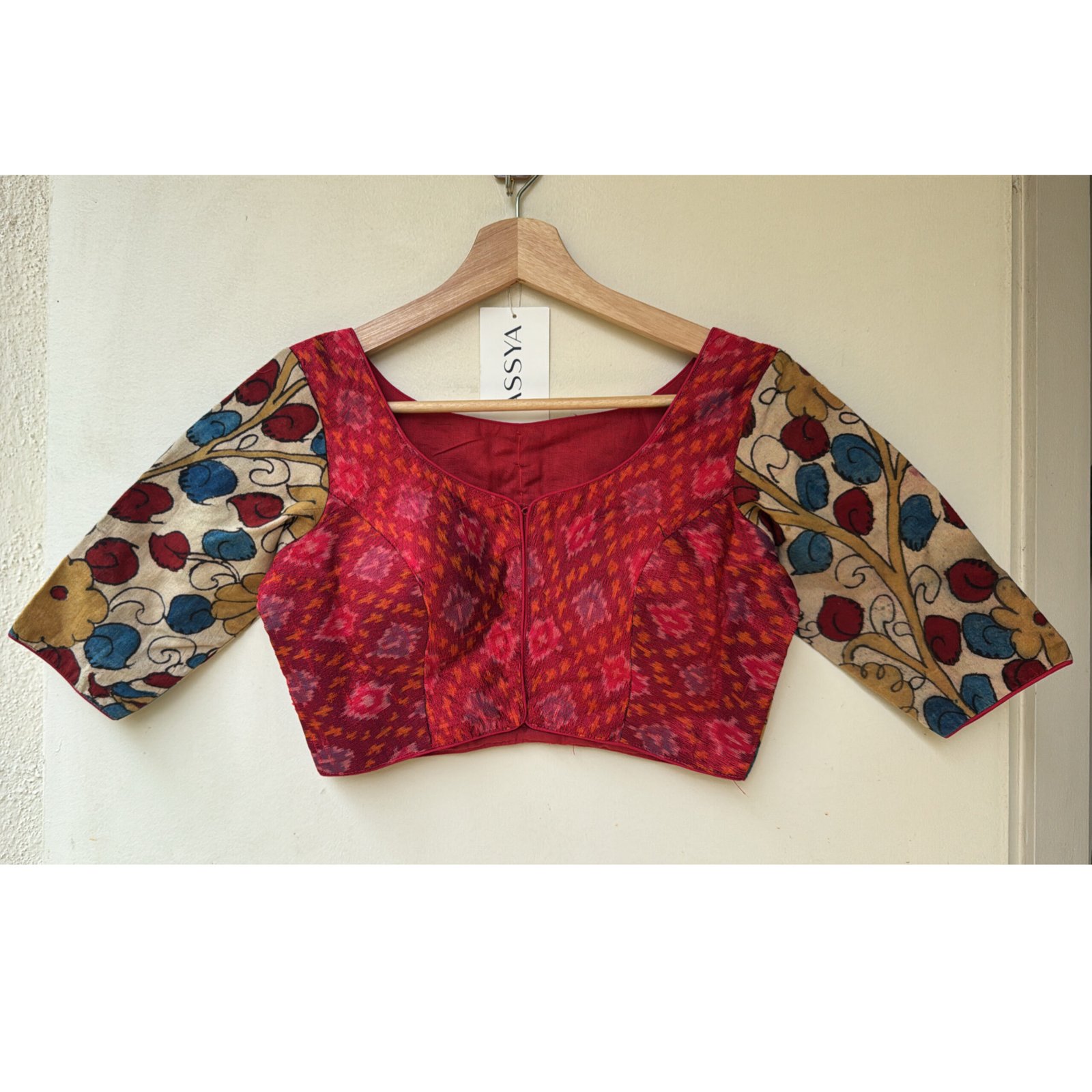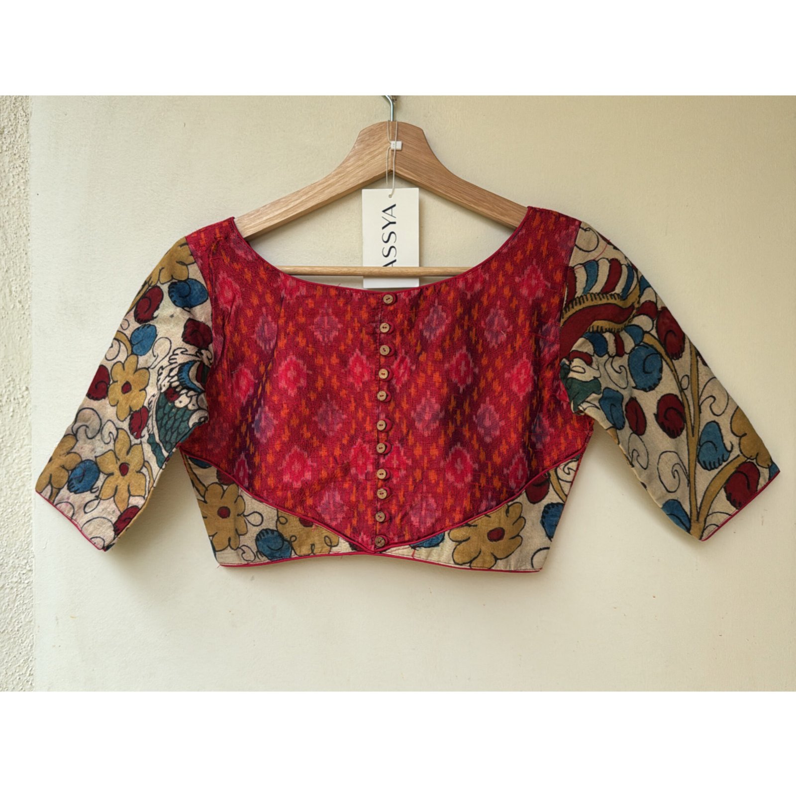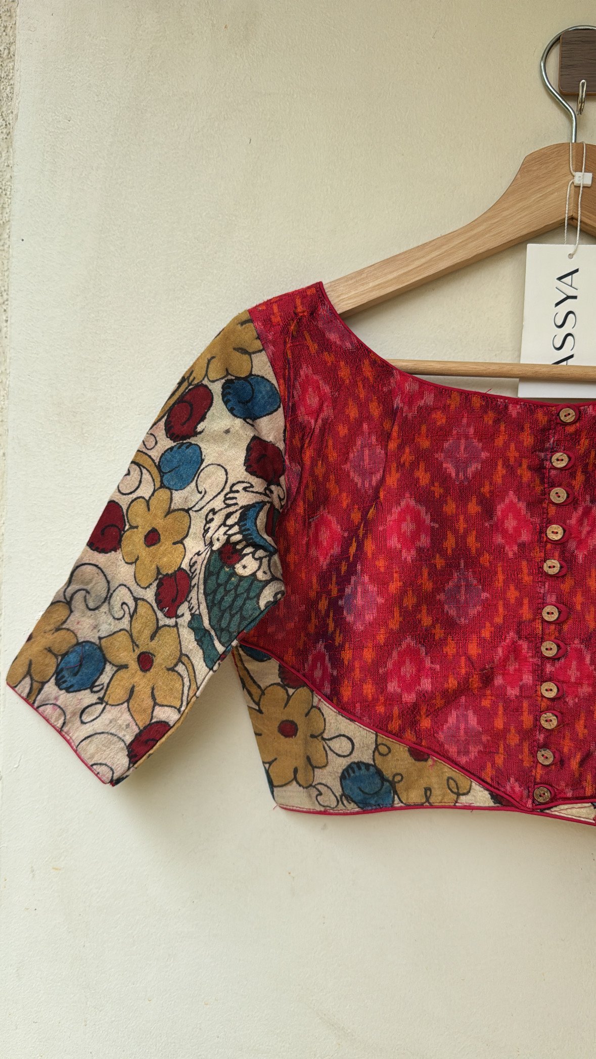 Silk ikkat with hand-painted kalamkari patch and woodden button detailing.